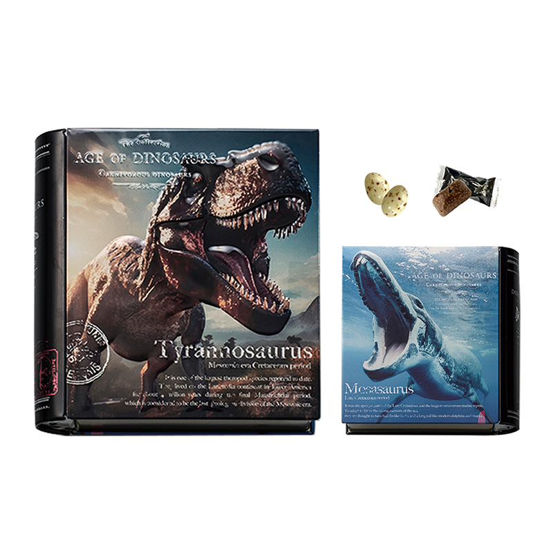 まるで恐竜図鑑のような商品。チョコクランチとアーモンドタマゴチョコのセットです。