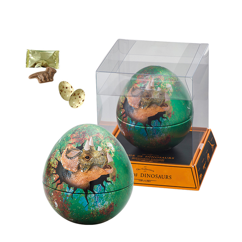 恐竜のたまごのような缶に、レリーフチョコレートと