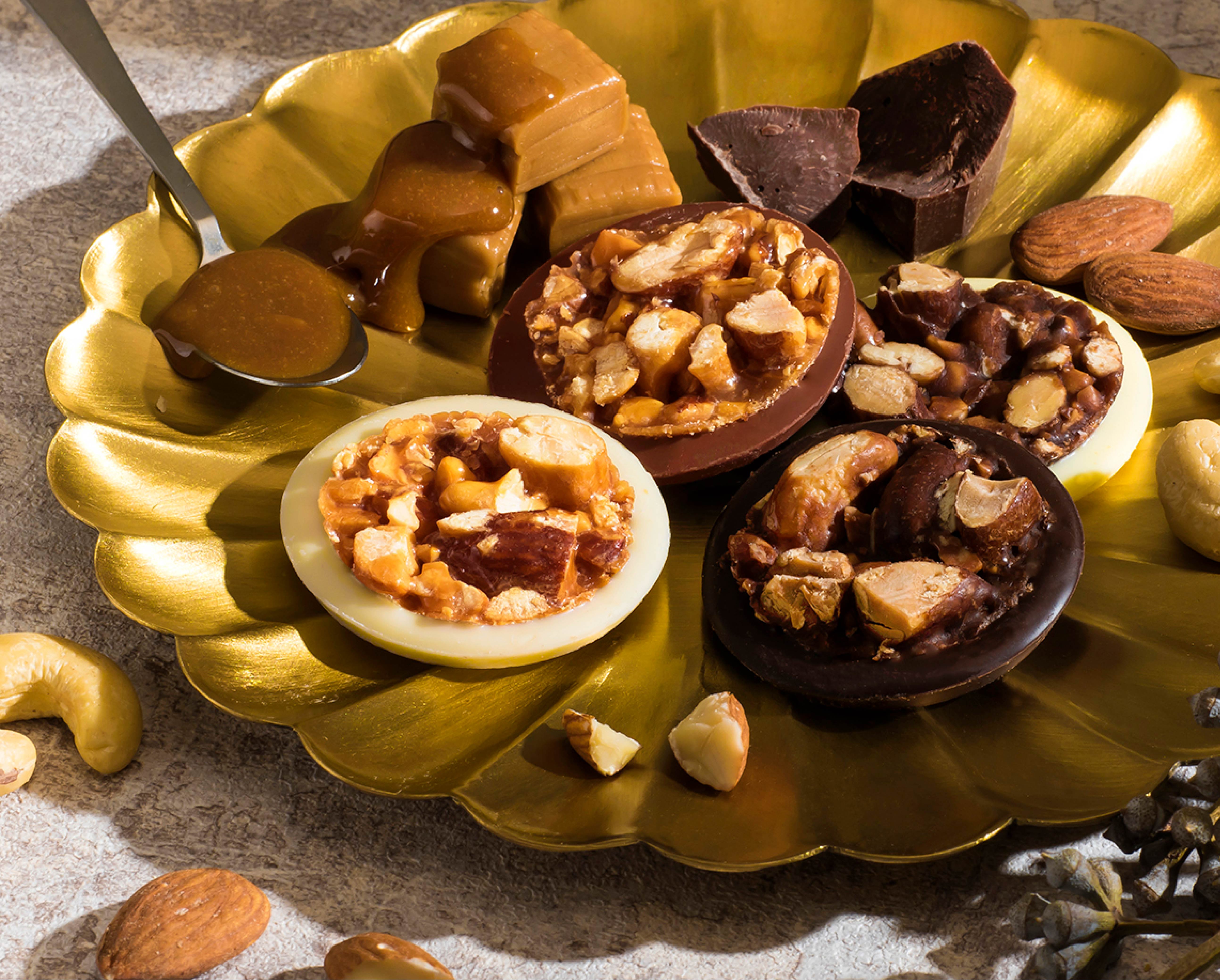 アーモンドとカシューナッツのカリカリとした軽快な食感とキャラメルの香ばしさがチョコレートと出会いました。